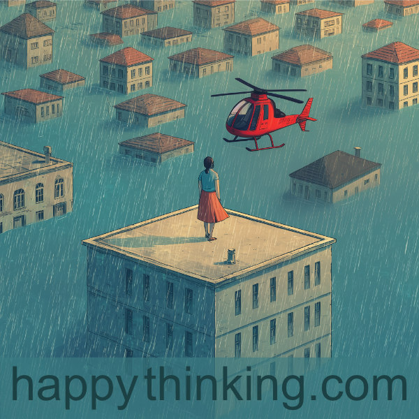 The flood waters are now rising even more. As this happens, a helicopter appears in the sky and hovers near Tania. The pilot announces from the helicopter that he can come near and rescue her, but again, Tania replies the same thing as before, “I have faith in the Lord that the floods will recede, so while I am thankful for your offer, I will decline it”