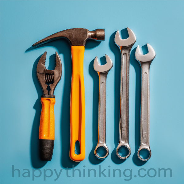 As mentioned before, “Happy Thinking” is about dealing with unhelpful thoughts using psychological “tools”. Of course, the tools one uses to deal with one’s mind are not metal tools, like those a mechanic might use! Please do not even think of using real tools!